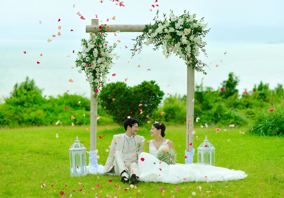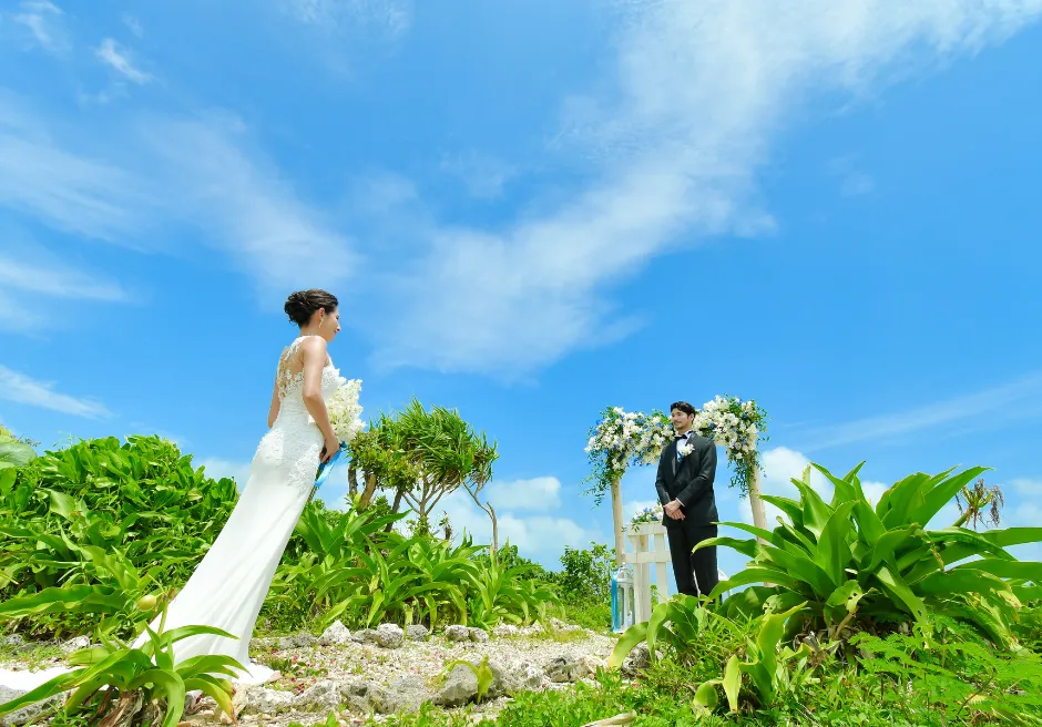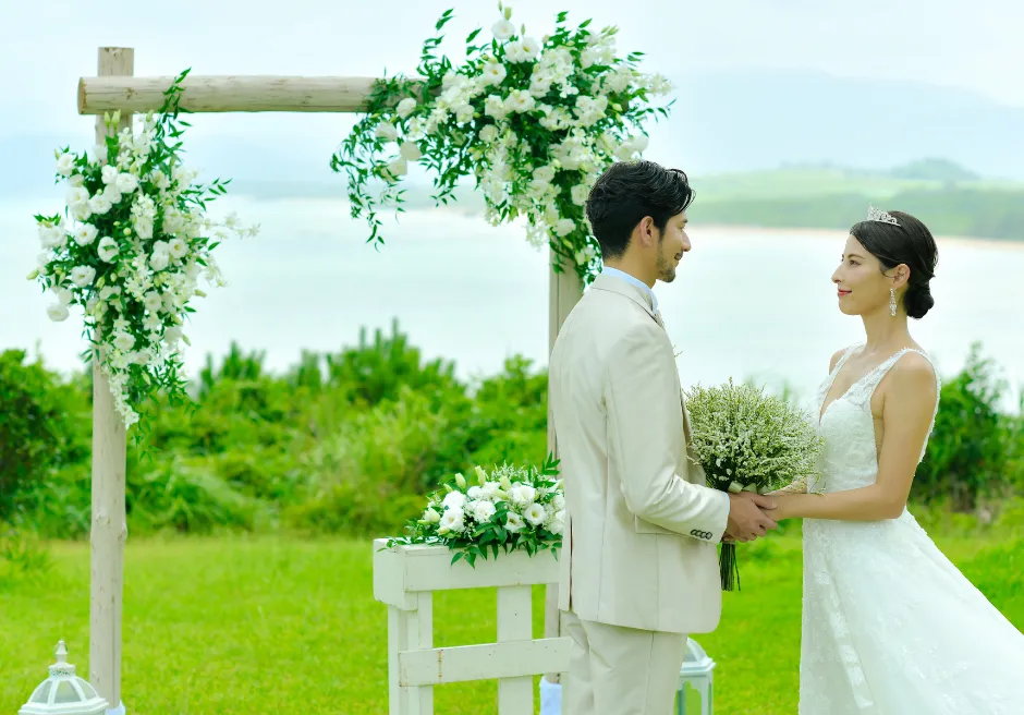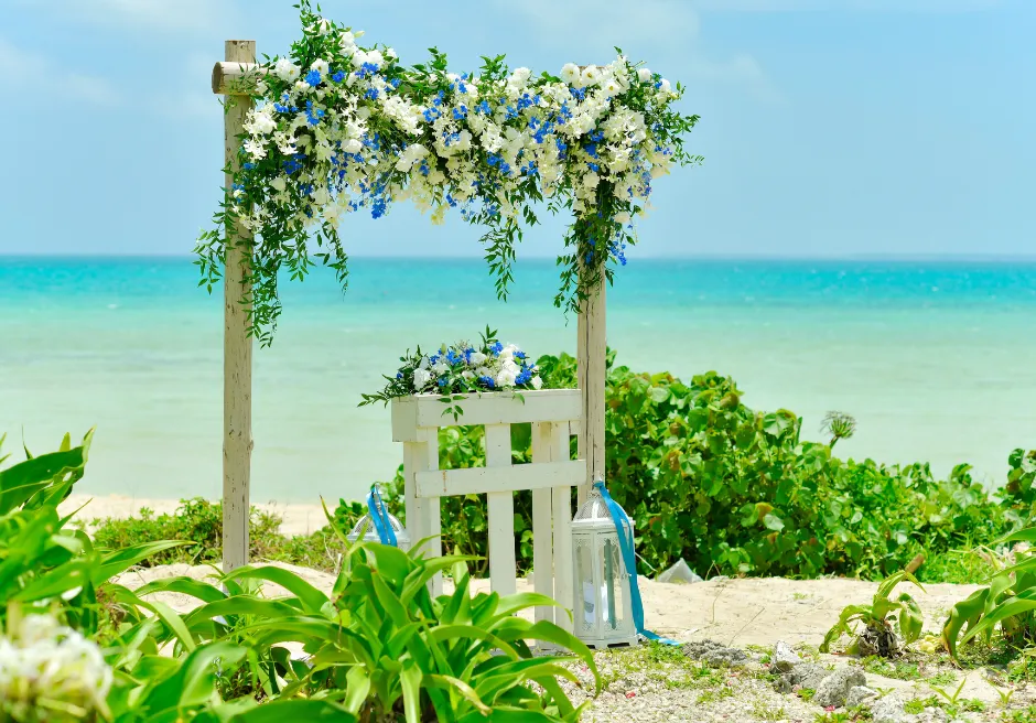 セレモニーはビーチに特設されたウェディングアーチの前で執り行われ、波音をBGMにしたナチュラルでリゾート感のあるウェディングシーンが叶います。写真撮影では、砂浜や水際、リゾート内のさまざまなビュースポットへ移動でき、はいむるぶしならではの幻想的で多彩なカットを残せます。
