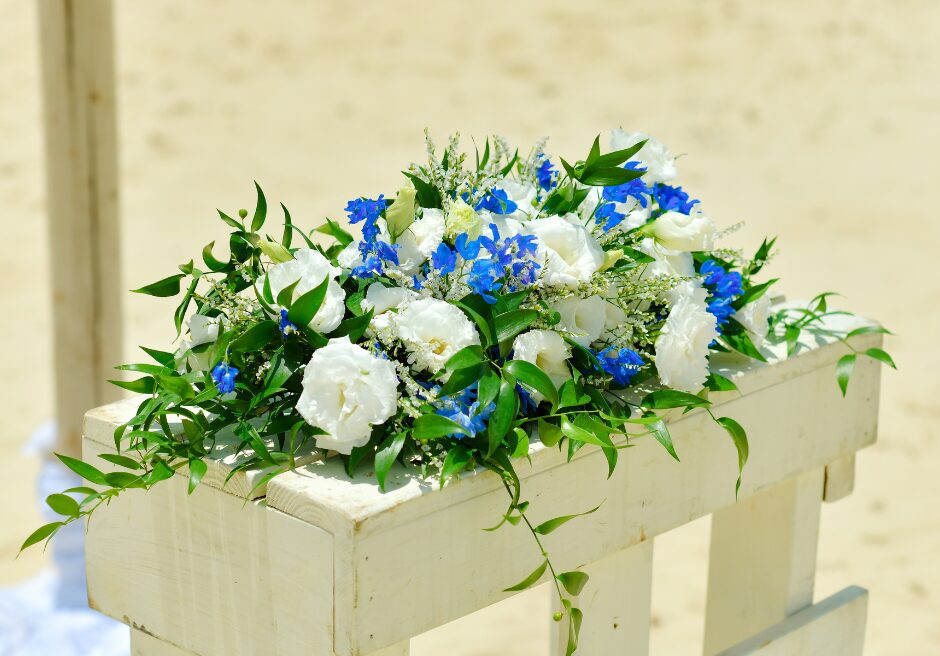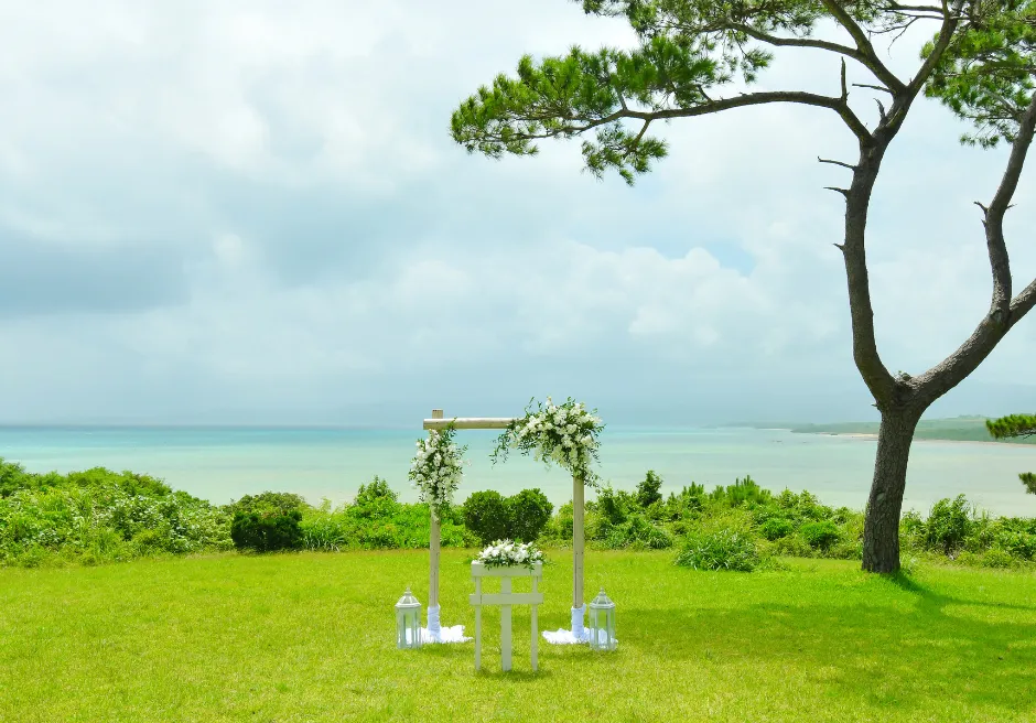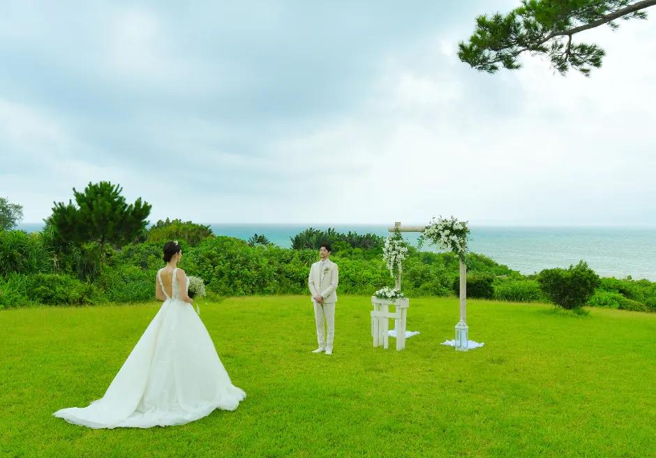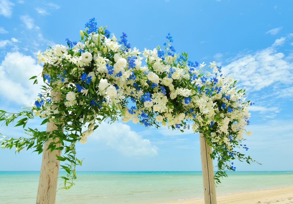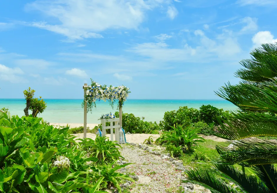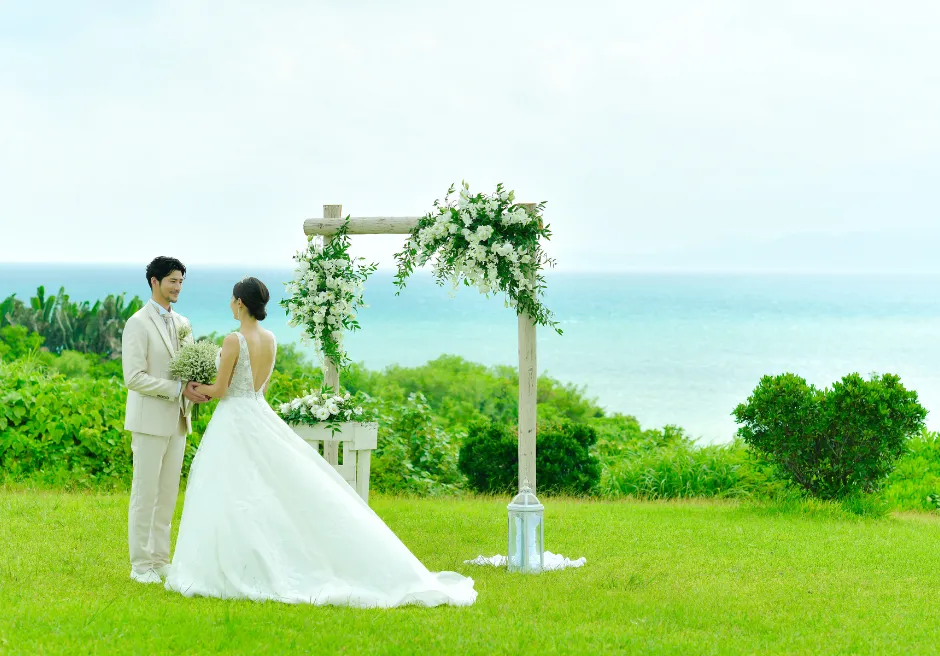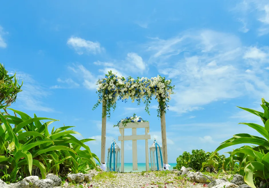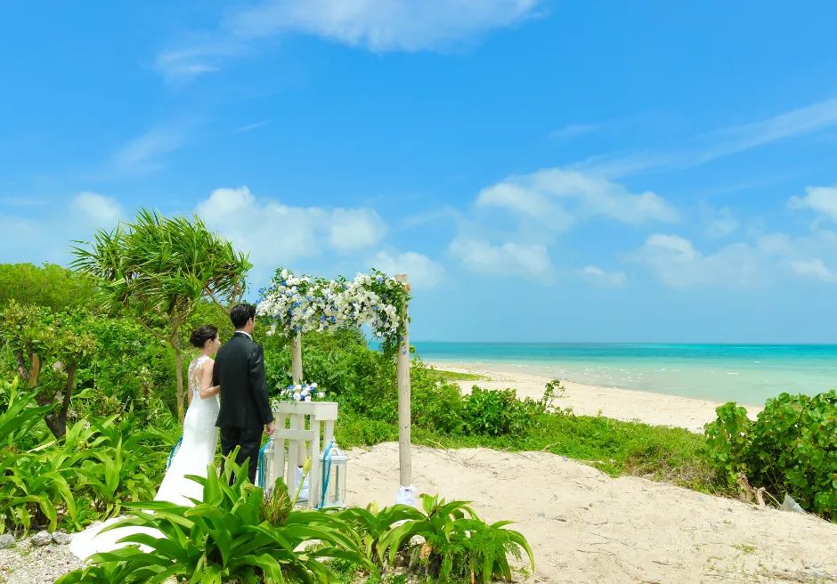 はいむるぶしの人気フォトウェディング・スポットであるビーチテラスの奥に広がる美しいビーチを一望するビーチ・ガーデンでの挙式です。ビーチ・ガーデンの眼下には美しい白砂のビーチと、コバルトブルーとエメラルドグリーンのコントラストが美しい広大な海が広がります。シーブリーズ吹き抜ける爽快なガーデン・ウェディングです。