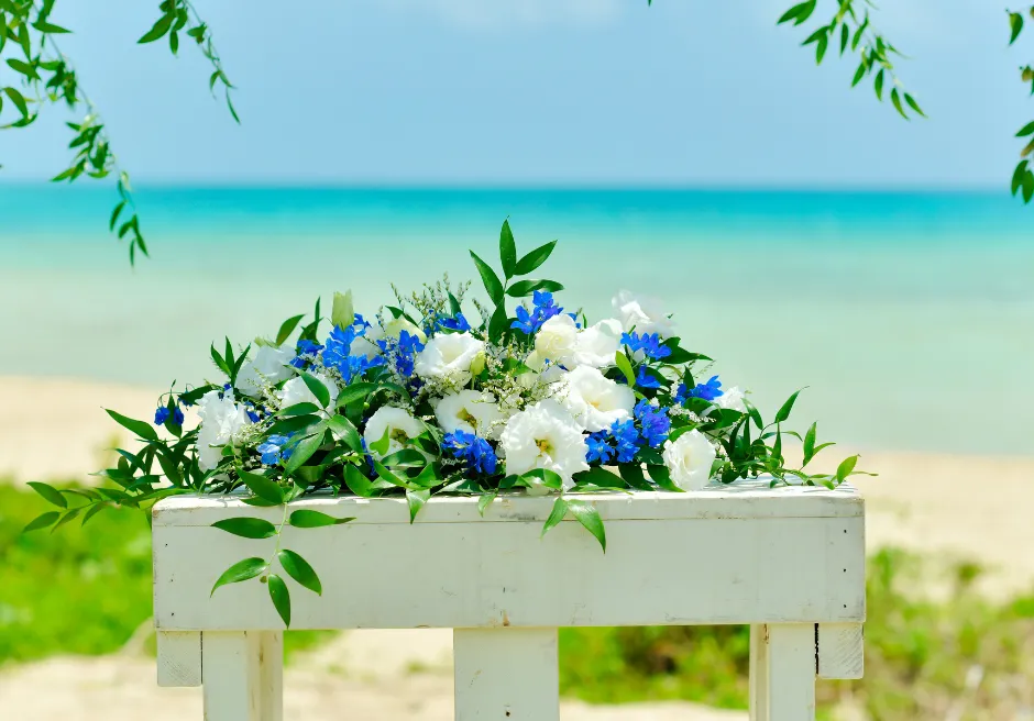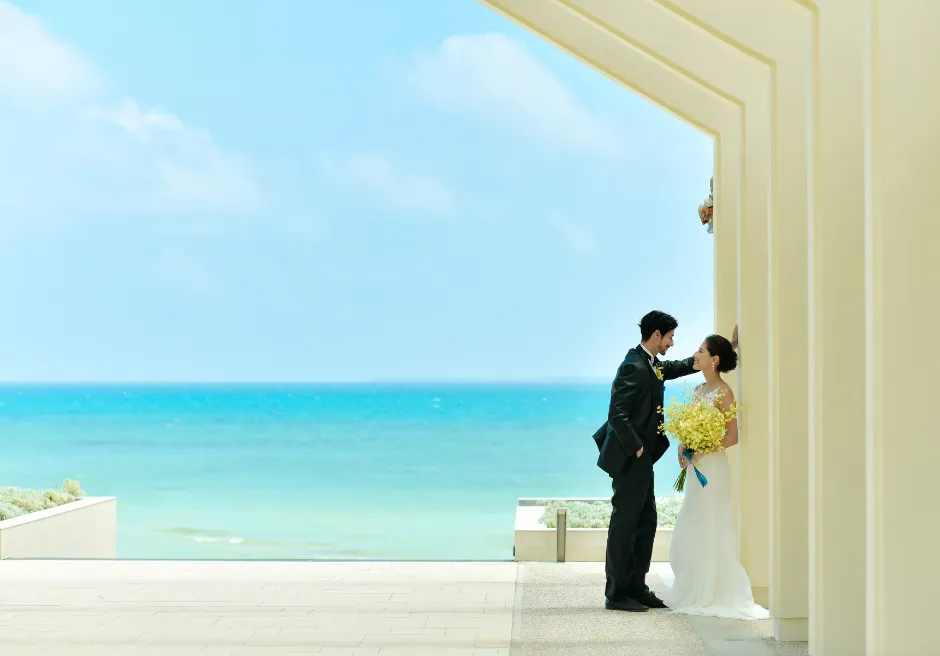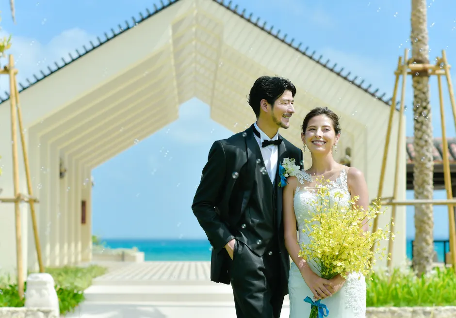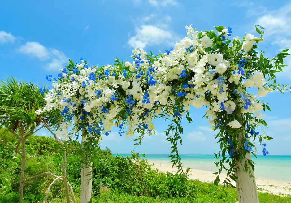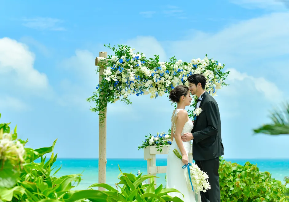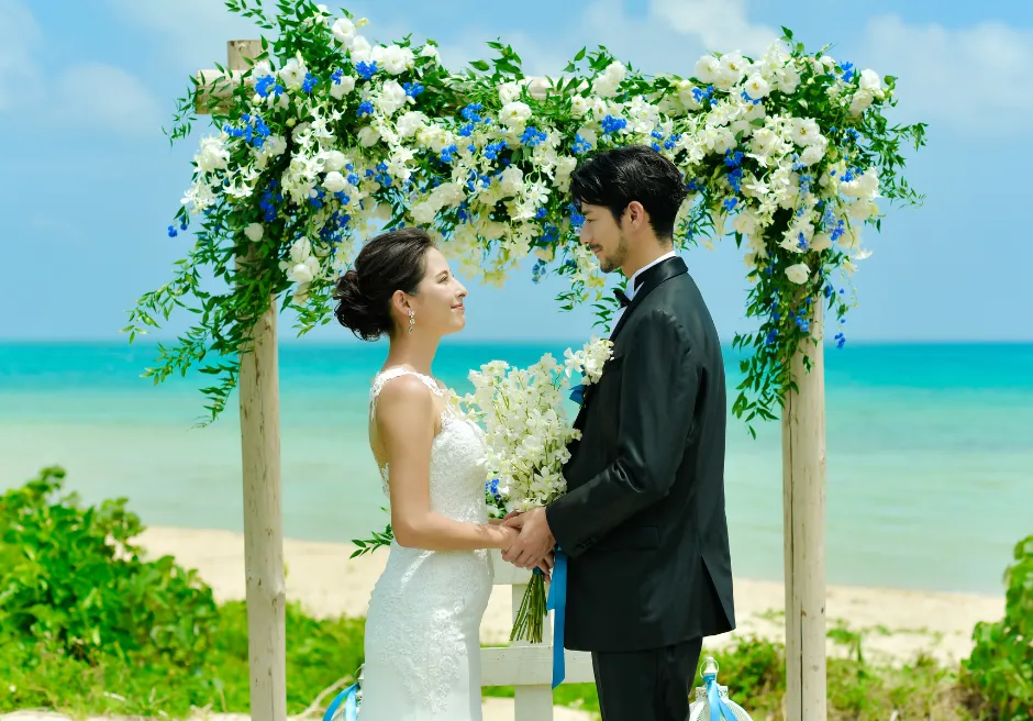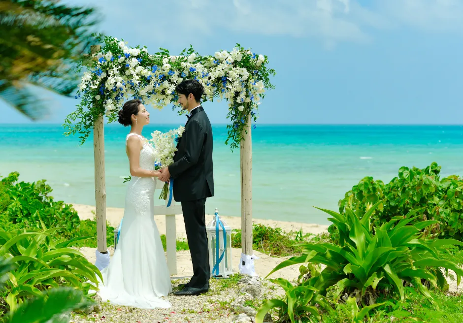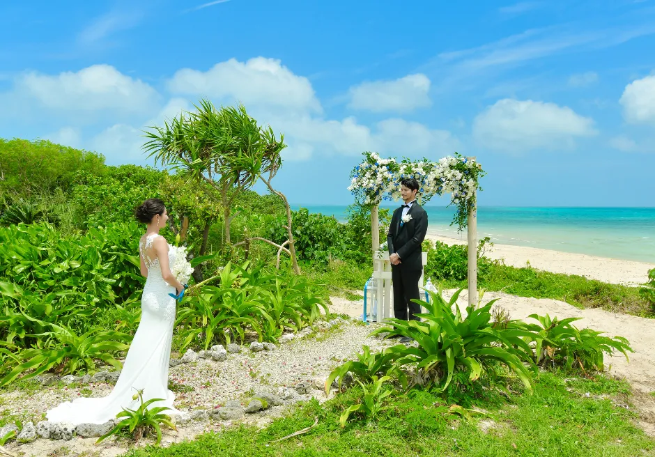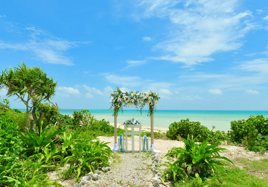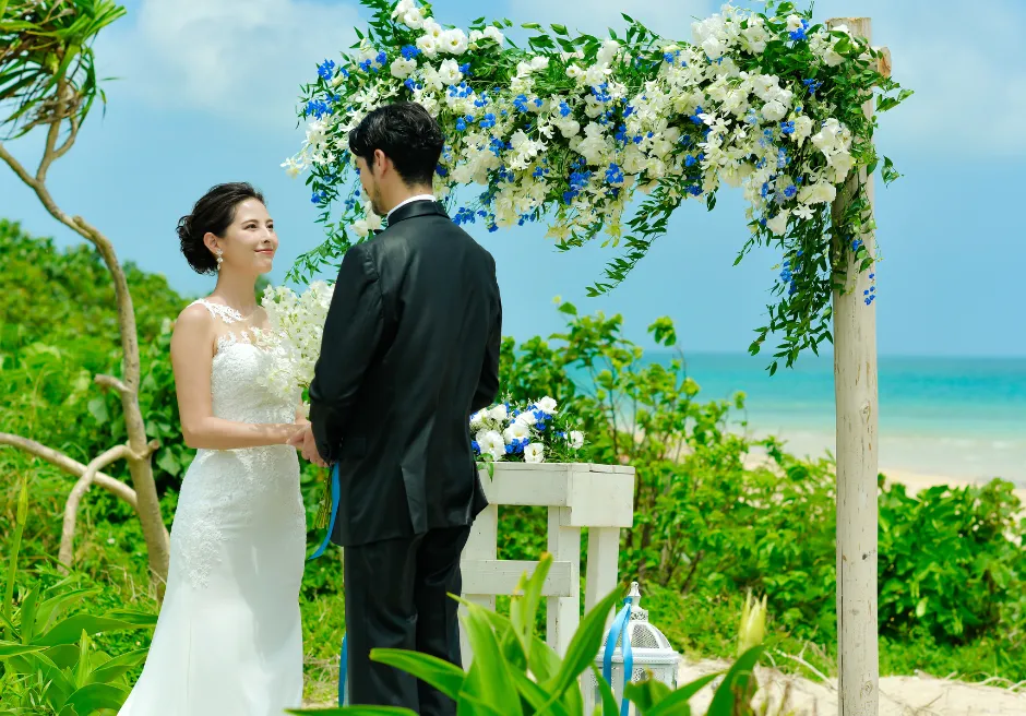 はいむるぶし小浜島では、海を見渡すガーデンで行うプライベート感あふれる「ビーチ・ガーデン・ウェディング」をご案内しています。緑豊かなガーデン越しに広がるエメラルドブルーの海が、ふたりのセレモニーをより特別なものへと引き立て、ビーチとはまた違う落ち着いた雰囲気の中で心に残る時間をお過ごしいただけます。